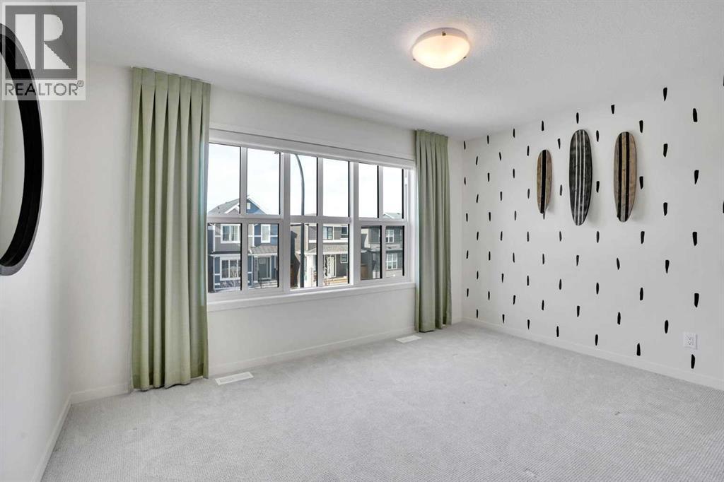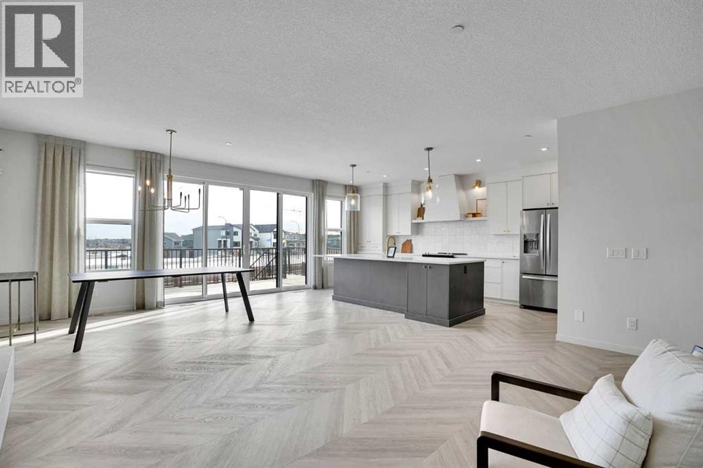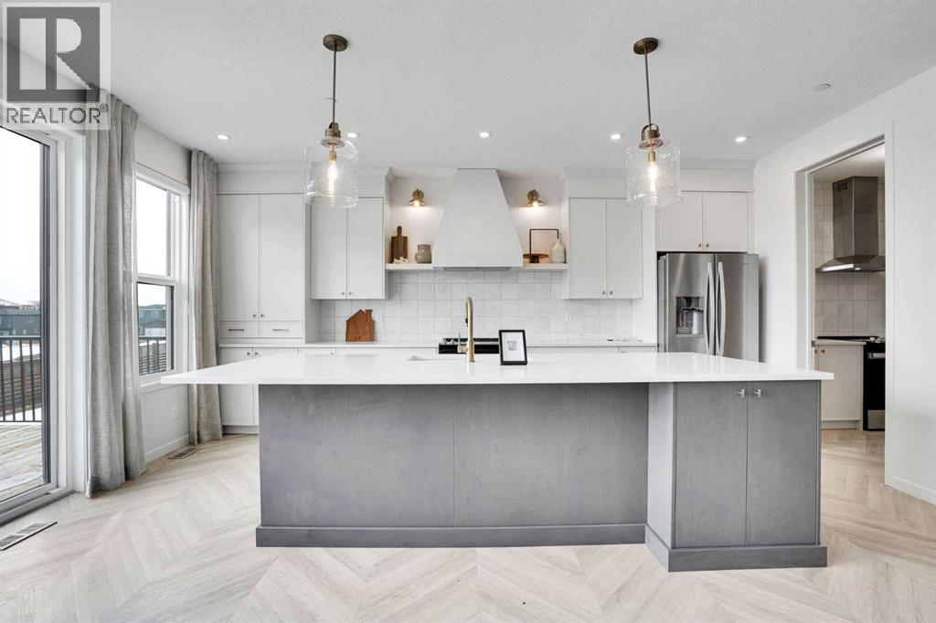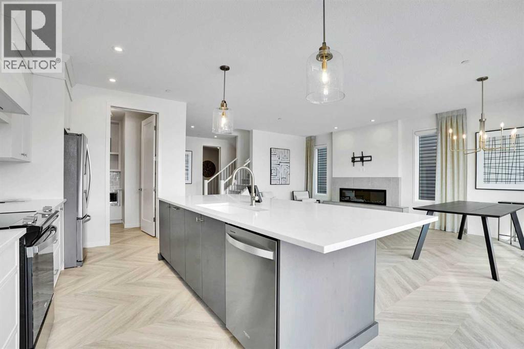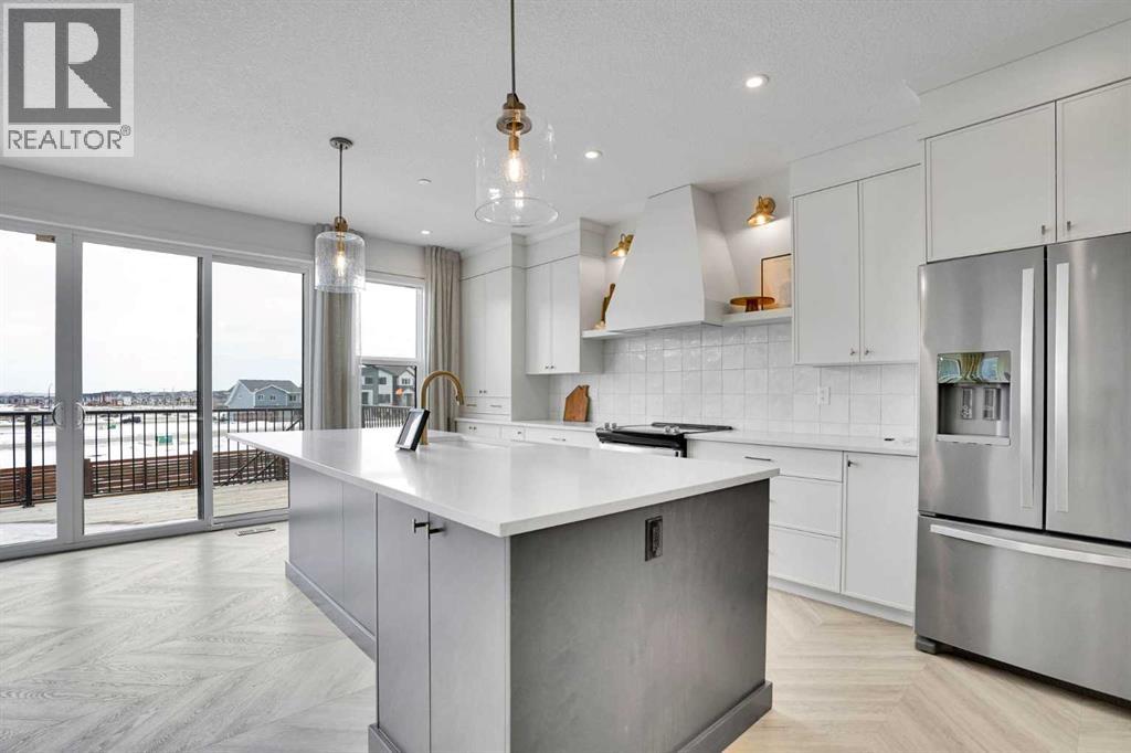 Nestled in the vibrant and family-friendly community of Livingston, this stunning former show home has never been lived in and showcases exceptional craftsmanship, high-end upgrades, and thoughtful design throughout. Step inside to discover a bright open-concept main floor featuring soaring 8’ interior doors, luxury vinyl plank flooring, and elegant finishes that create a warm yet sophisticated atmosphere. Huge windows throughout the open-concept living space bring in an abundance of natural sunlight, creating a bright and welcoming environment. The inviting living room features a beautiful vertical shiplap feature wall with a tiled electric fireplace, blending modern style with cozy comfort. The chef-inspired kitchen is both functional and impressive with quartz countertops, two-tone cabinetry, a large central island, and in addition to the main kitchen, there is a separate spice kitchen that provides extra prep and cooking space. The dining nook opens onto an oversized deck, perfect for summer BBQs, entertaining guests, or relaxing outdoors. A main floor bedroom and full bathroom provide flexibility for guests, a home office, or multi-generational living. Upstairs, the primary retreat offers a spa-inspired ensuite with a custom tiled shower, soaker tub with tile ledges, dual sinks, quartz countertops, and a spacious walk-in closet, while three additional generously sized bedrooms provide plenty of space for family or guests. The upper level also includes a convenient laundry room and a beautiful, cozy bonus room ideal for relaxing or spending time with family. Every detail of this home reflects quality and thoughtful upgrades, including upgraded lighting, designer hardware, and an installed security system. Outside, enjoy the completed oversized deck while taking in the peaceful surroundings of Livingston. Residents also enjoy access to the impressive Livingston Hub, a state-of-the-art facility featuring a skating rink, splash park, gymnasium, tennis courts, and event spaces, along with numerous parks, playgrounds, and pathways throughout the neighbourhood, with convenient access to Stoney Trail and Deerfoot Trail for easy commuting. Move-in ready and never lived in, this exceptional show home offers the perfect combination of designer elegance, everyday functionality, and outstanding value. (id:63190)
