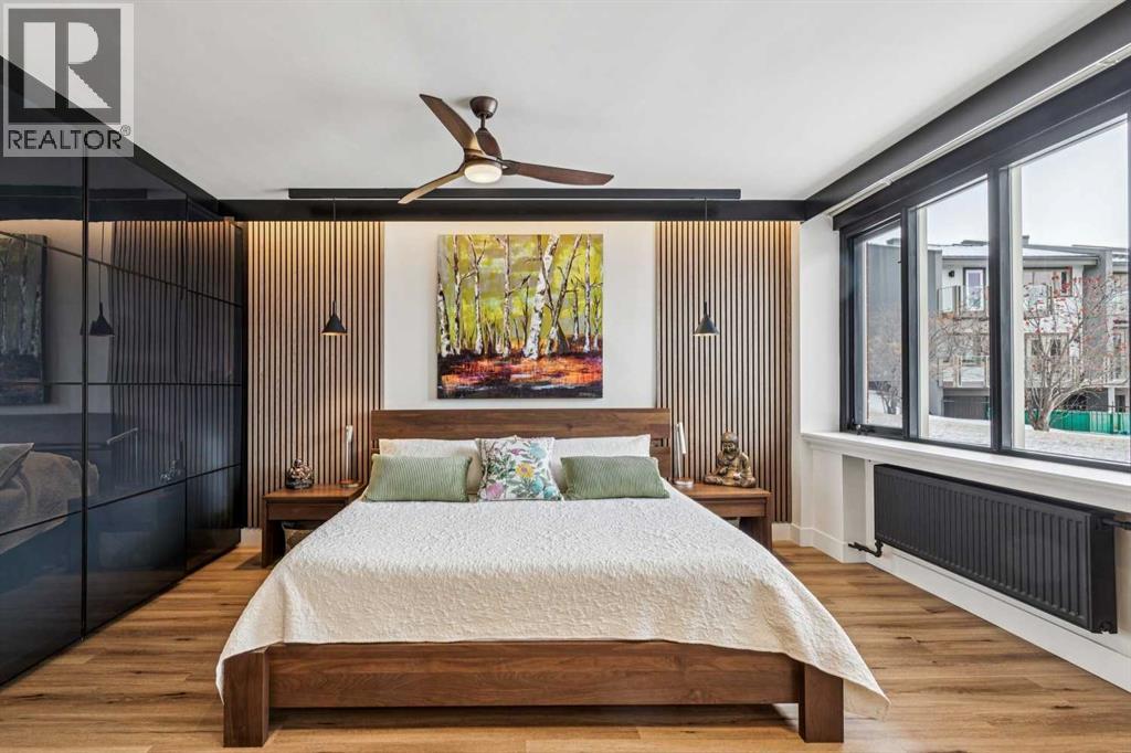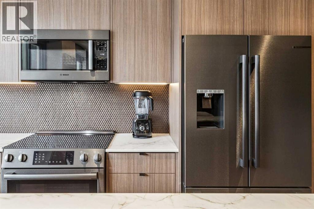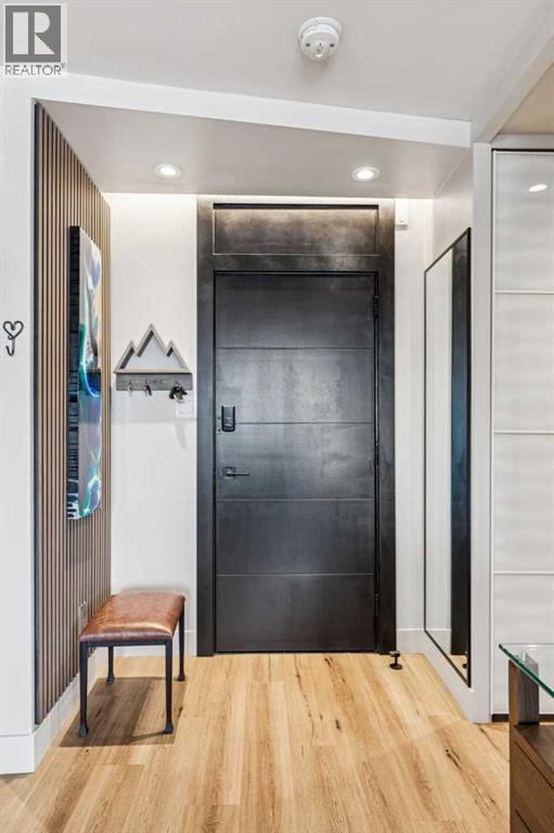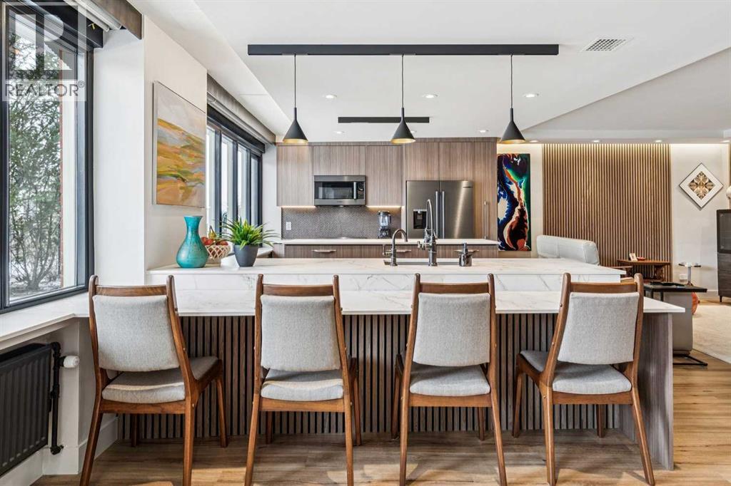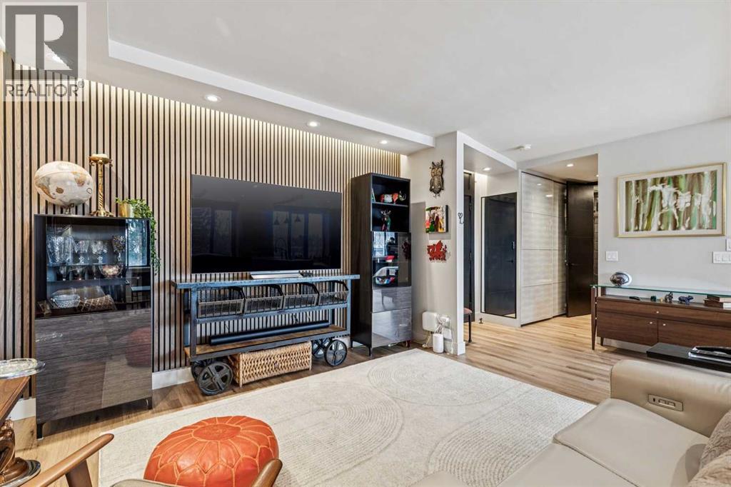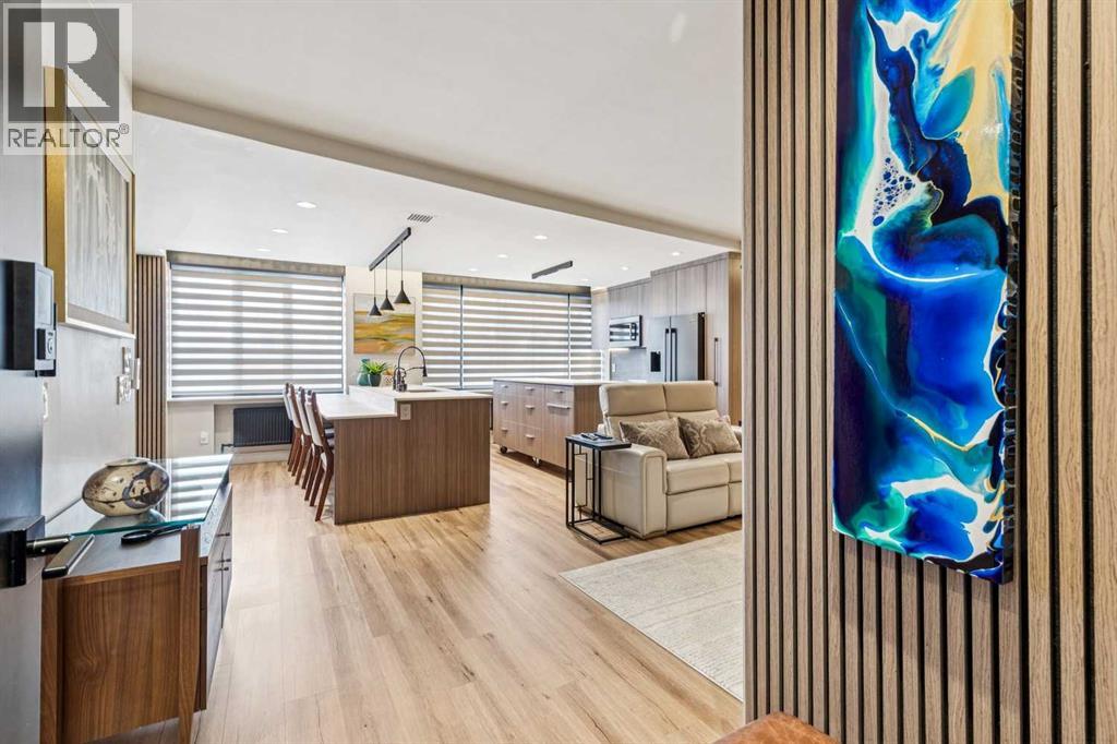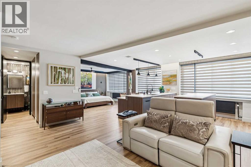 Welcome to this stunning, one-of-a-kind, luxury apartment in the highly desirable Rideau Towers. A little over two years ago, this unit was completely stripped down and redesigned into a gorgeous executive condo using top-of-the-line finishes throughout. This is a $200,000+ renovation!!!! Perfect as a corporate rental unit for visiting employees, a young professional couple who want to be close to the trendy 4th Street amenities, or someone with mobility needs. Upon entering you’ll feel the luxury of the beautiful and durable “stone composite” flooring with the look and feel of real hardwood. The space is flooded with natural light from the window wall which spans 30’ in length. When you don’t want all that light, just press a button and the motorized blinds will come down all together or separately depending on how you program them. The kitchen features custom-built Richelieu cabinets with a built-in slide-out pantry, hidden washer and dryer, movable island (on wheels) that allows you to reconfigure the kitchen layout, and a built-in dining area. The Dekton countertops flow throughout the kitchen, dining area and along the window ledges. The high-end appliances are mostly a stylish Black-Stainless finish and include a whisper quiet Bosch dishwasher, washer and dryer. All the lighting is from Cartwright and all on dimmer switches. The walls are finished with acoustic slated wood panels… they not only look beautiful but help with the acoustics in the apartment. The well-designed floor plan uses every square inch possible to maximize closet and storage space. Also designed into this plan is the flexibility to build a sliding wall system to separate the bedroom, and wider spaces and doorways to accommodate people with mobility needs such as wheelchair accessibility. The building entrance was recently redesigned and upgraded to include a wheelchair ramp and automatic door opening systems. The extra-large parking stall for this unit is located on the same level and about 50’ from the apartment door. This convenient parking spot is perfect for someone with an over-height or extra-long vehicle, or someone needing extra space beside the vehicle of access. Renfrew House is also a pet friendly building. This luxury apartment is priced well below replacement cost. Come view it today!!! (id:63190)