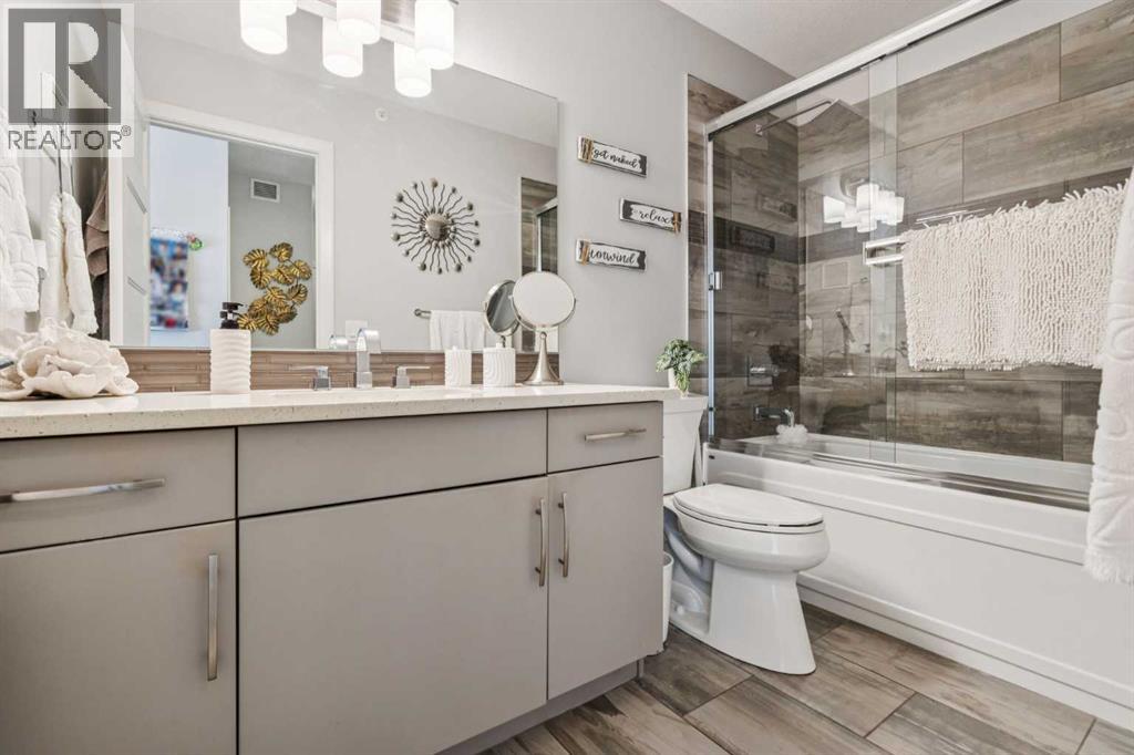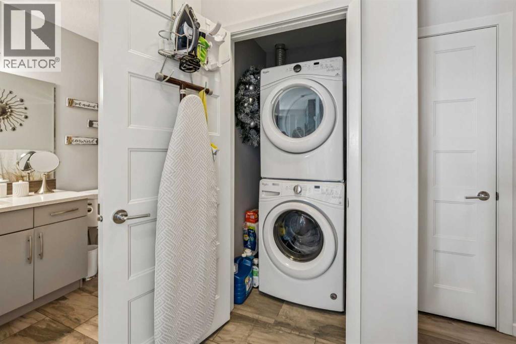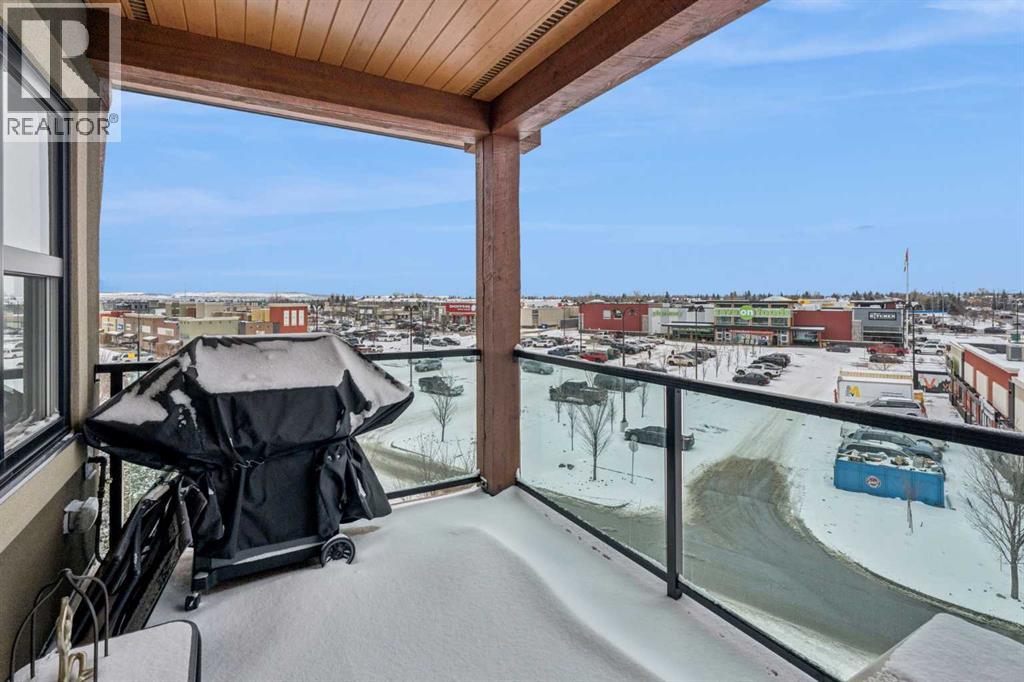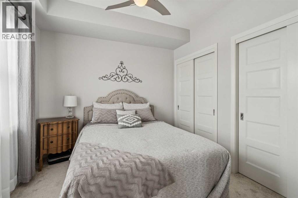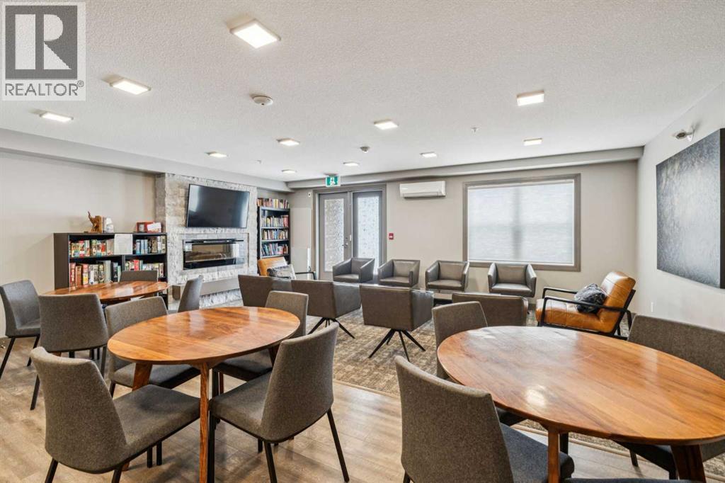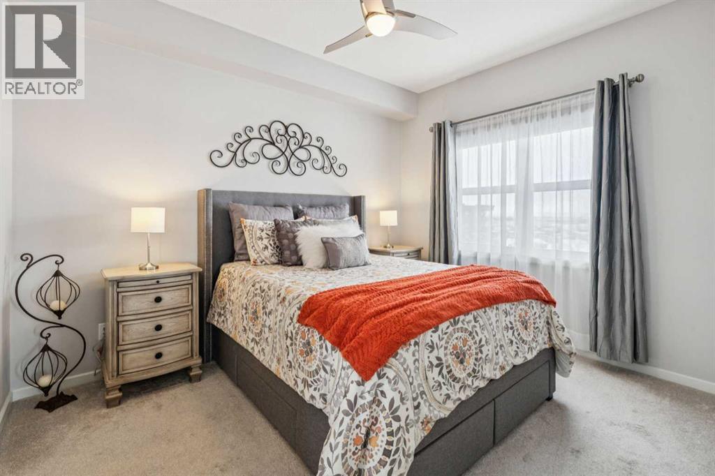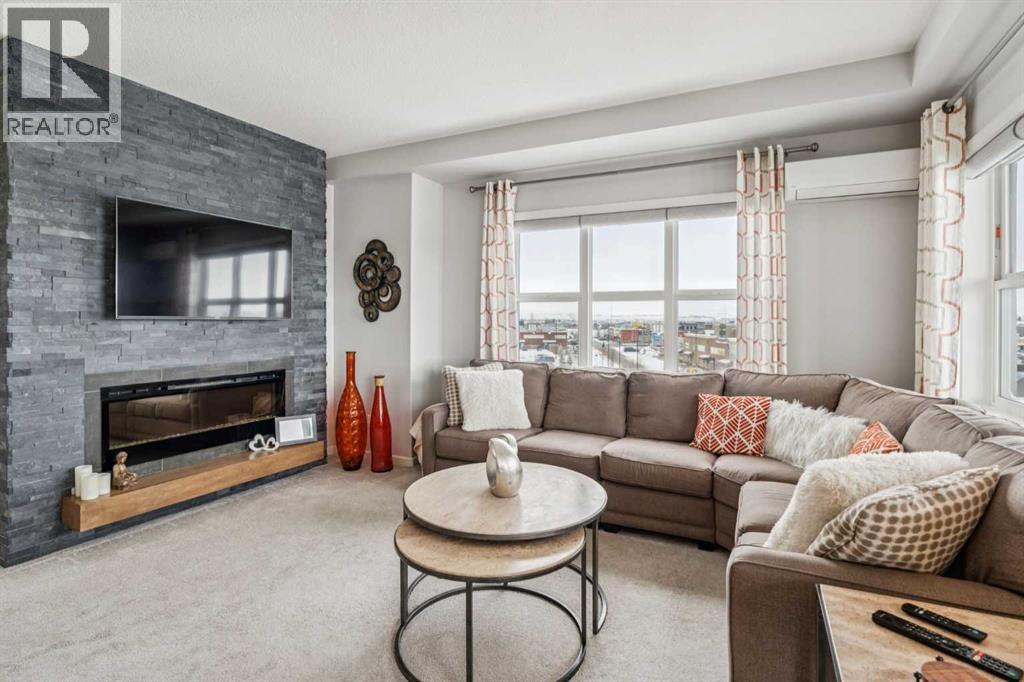 CHECK OUT OUR 24/7 VIRTUAL OPEN HOUSE. Welcome to The Chateaux, Airdrie’s premier 55+ complex, thoughtfully designed for comfortable, low-maintenance living in a vibrant community setting. This top-floor corner unit offers over 900 sq. ft. of bright, open living space with 2 bedrooms and 2 bathrooms, including a primary suite with private ensuite.The open-concept floorplan is perfect for everyday living and entertaining, featuring quartz countertops and over $50,000 in upgrades. The kitchen is a standout with a premium stainless steel appliance package, custom hood fan, and a microwave built seamlessly into the island. Additional upgrades include a stylish fireplace, air conditioning, high-quality blinds, upgraded light fixtures, and a convenient screen door for added comfort.Step outside to your covered private deck with gas BBQ hookup, the perfect spot for morning coffee or evening relaxation. This home also includes a titled underground parking stall with a storage cage above, providing both convenience and security.Residents of The Chateaux enjoy exceptional amenities, including a beautifully landscaped courtyard, a welcoming amenity/social room available for private bookings, and a secure underground workshop for woodworking enthusiasts. The building also features secure underground access, elevator service, bike storage, and a welcoming lobby, all within a well-maintained complex with in-floor heating for year-round efficiency and comfort.Ideally located within walking distance to groceries, shopping, restaurants, medical services, and banking, this home also offers easy access to Deerfoot Trail, especially with the convenient new 40th Ave exit. Enjoy nearby access to the Genesis Place recreation complex, East Lake walking/biking paths, and a dog park nearby in Kings Heights too.This pet-friendly community (two pets permitted, with size restrictions) offers the perfect balance of comfort, convenience, and community for those looking to enjoy an acti ve, maintenance-free lifestyle. Book your viewing today! (id:63190)