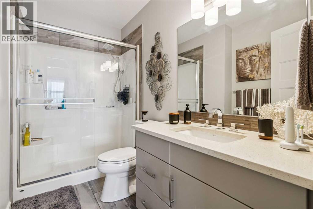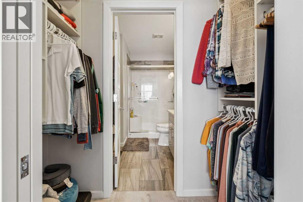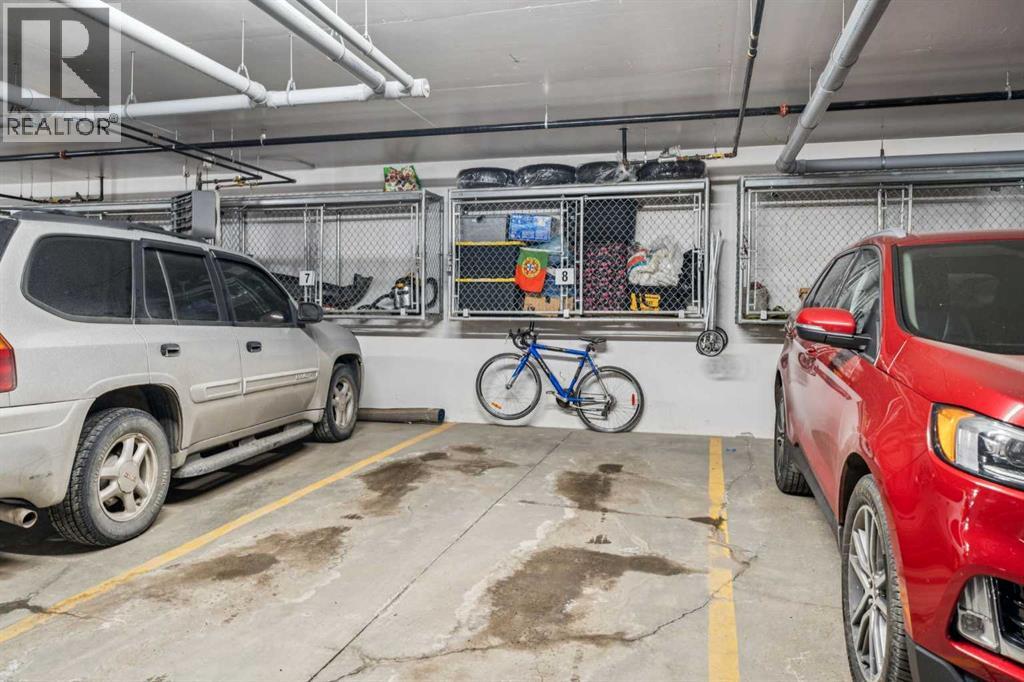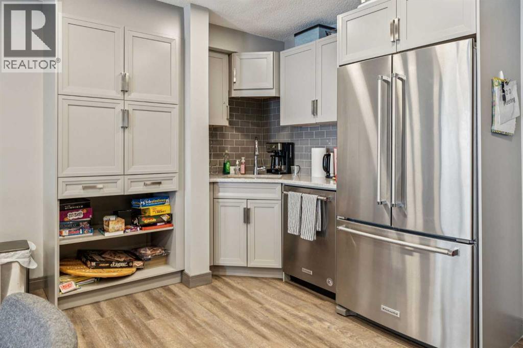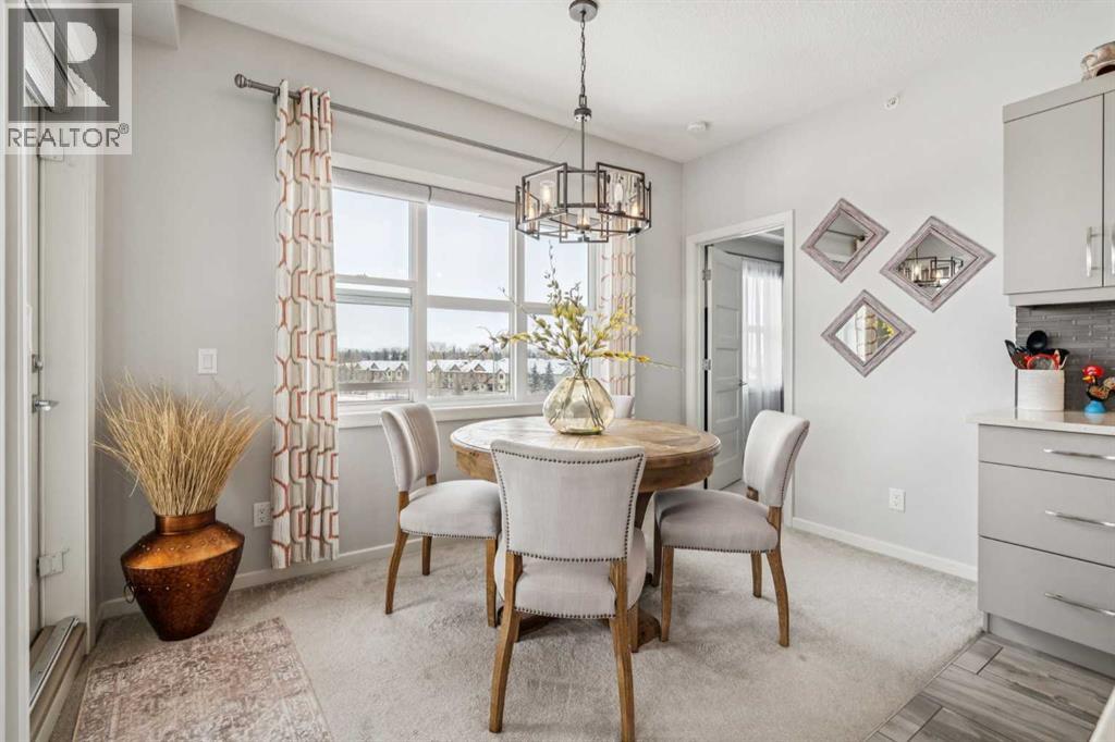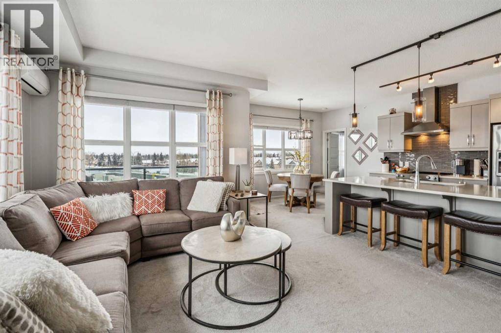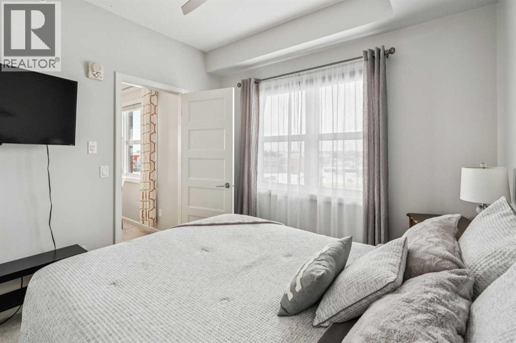 CHECK OUT OUR 24/7 VIRTUAL OPEN HOUSE. Welcome to The Chateaux, Airdrie’s premier 55+ complex, thoughtfully designed for comfortable, low-maintenance living in a vibrant community setting. This top-floor corner unit offers over 900 sq. ft. of bright, open living space with 2 bedrooms and 2 bathrooms, including a primary suite with private ensuite.The open-concept floorplan is perfect for everyday living and entertaining, featuring quartz countertops and over $50,000 in upgrades. The kitchen is a standout with a premium stainless steel appliance package, custom hood fan, and a microwave built seamlessly into the island. Additional upgrades include a stylish fireplace, air conditioning, high-quality blinds, upgraded light fixtures, and a convenient screen door for added comfort.Step outside to your covered private deck with gas BBQ hookup, the perfect spot for morning coffee or evening relaxation. This home also includes a titled underground parking stall with a storage cage above, providing both convenience and security.Residents of The Chateaux enjoy exceptional amenities, including a beautifully landscaped courtyard, a welcoming amenity/social room available for private bookings, and a secure underground workshop for woodworking enthusiasts. The building also features secure underground access, elevator service, bike storage, and a welcoming lobby, all within a well-maintained complex with in-floor heating for year-round efficiency and comfort.Ideally located within walking distance to groceries, shopping, restaurants, medical services, and banking, this home also offers easy access to Deerfoot Trail, especially with the convenient new 40th Ave exit. Enjoy nearby access to the Genesis Place recreation complex, East Lake walking/biking paths, and a dog park nearby in Kings Heights too.This pet-friendly community (two pets permitted, with size restrictions) offers the perfect balance of comfort, convenience, and community for those looking to enjoy an acti ve, maintenance-free lifestyle. Book your viewing today! (id:63190)