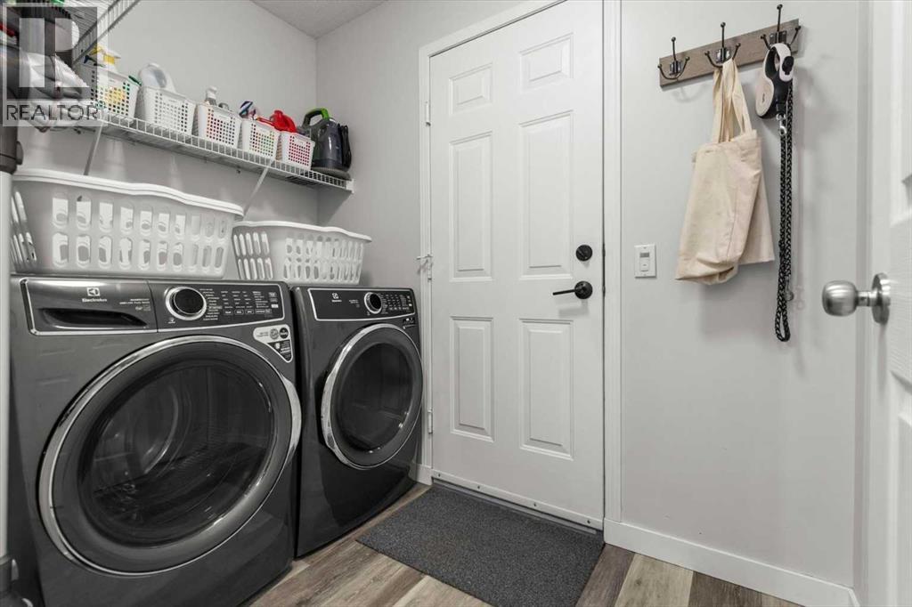 A dedicated laundry and mudroom offers excellent everyday functionality with front-load washer and dryer, built-in shelving, and direct access to the double car garage