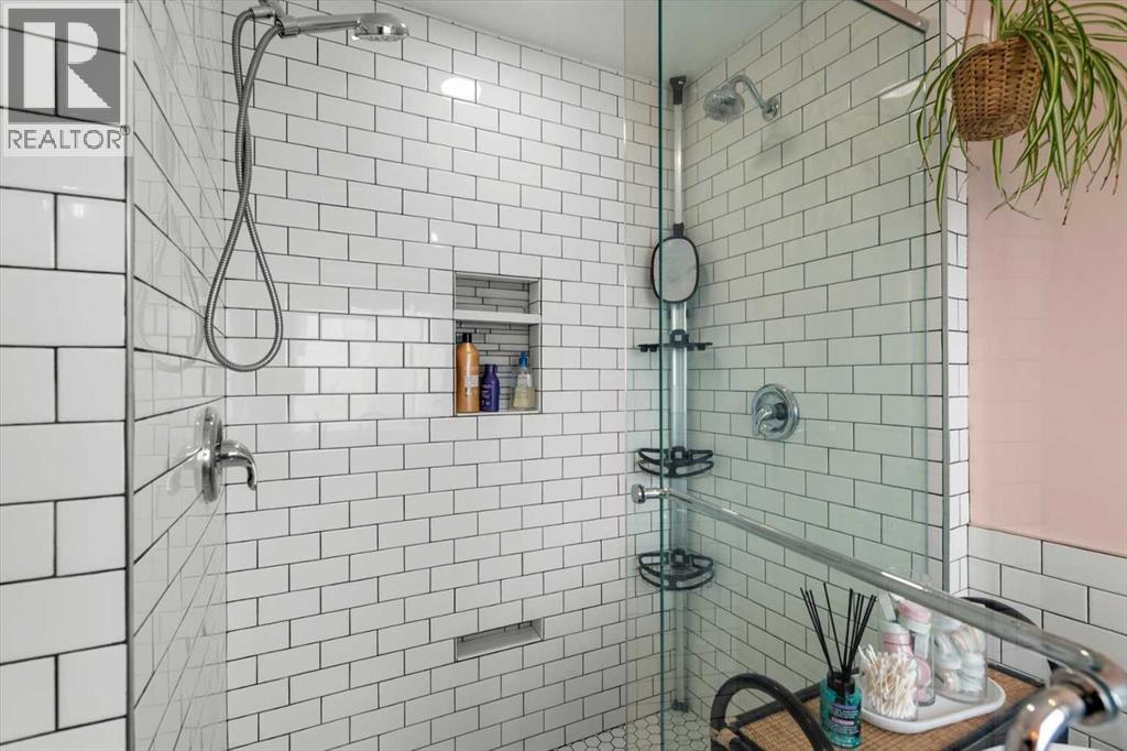 The glass-enclosed walk-in shower features classic subway tile and sleek fixtures, adding a clean and contemporary touch